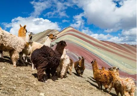 Vinicunca Rainbow Mountain, also known as Montaña de Siete Colores, is a breathtaking natural wonder located in the Andes of Peru, near Cusco. This geological marvel, standing at approximately 5,200 meters (17,100 feet) above sea level, is renowned for its vibrant, multicolored stripes of red, yellow, green, and blue, formed by mineral deposits over millions of years. The striking hues, created by iron oxide, sulfur, and other minerals, make the mountain appear as if painted by nature, offering a surreal and awe-inspiring landscape. Surrounded by rugged Andean peaks, snow-capped mountains, and grazing alpacas, Vinicunca provides a dramatic contrast between its vivid colors and the stark, high-altitude terrain, making it a must-visit destination for adventurers and photographers alike.